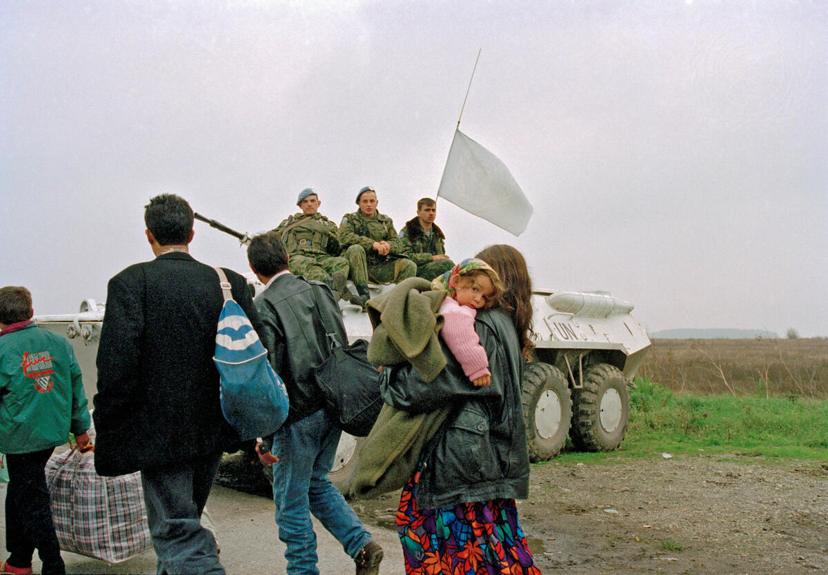 Families going to the Klisa-Osijek road ""market"" passby UNTAES peacekeepers. [c. 1997]
