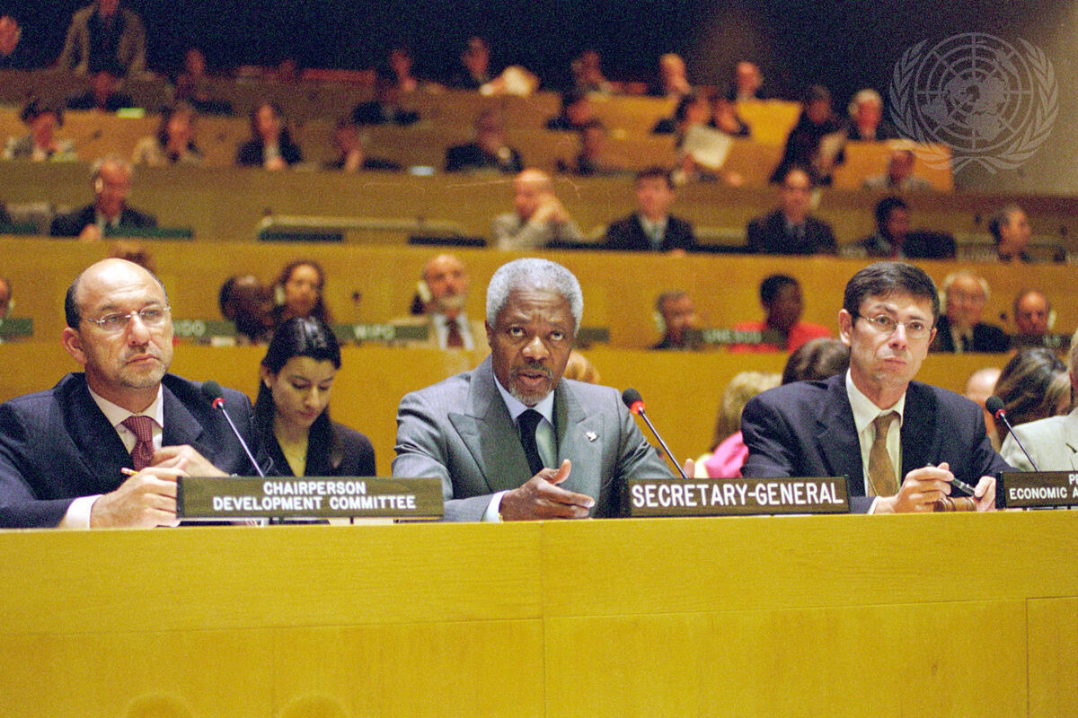 Secretary-General Kofi ANNAN (centre) addressing the Council as it met with the Bretton Woods Institutions to discuss the outcome of the Conference and of the meetings of the Development Committee and the International Monetary and Financial Committee.
