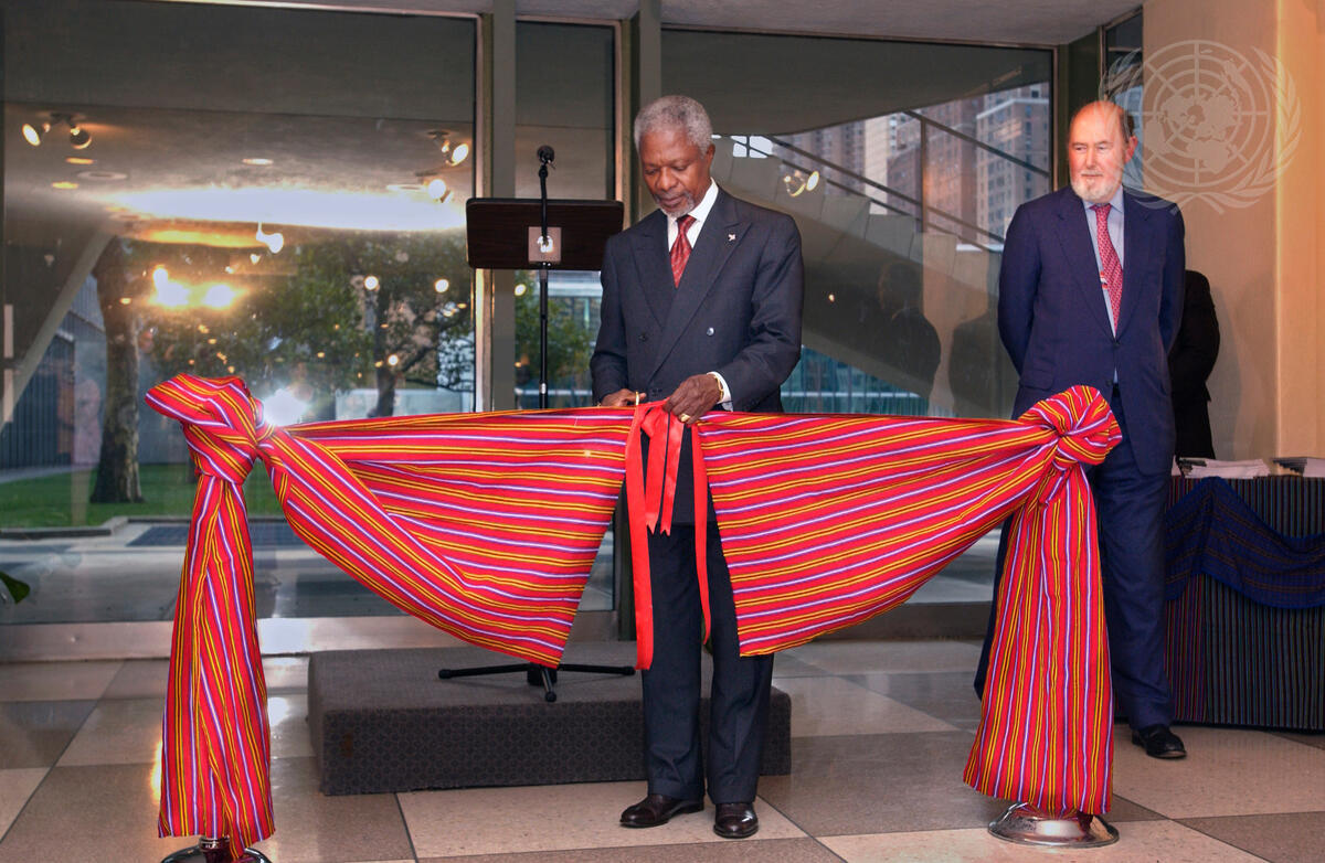 Secretary-General Kofi Annan (left) cuts the ribbon at the opening of the photographic exhibit entitled ""Guatemala: Images of Peace"", as Kieran Prendergast, Under-Secretary-General for Political Affairs, looks on.