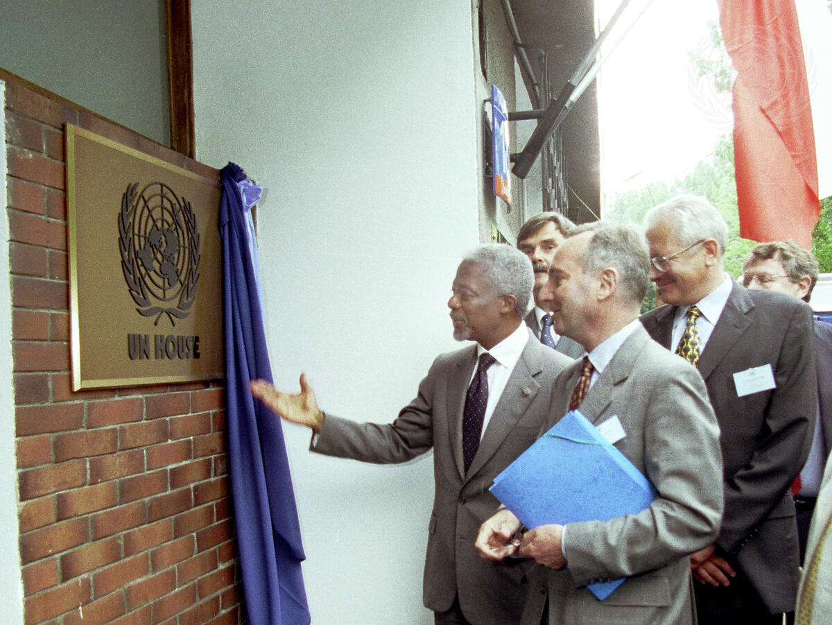 Secretary-General Kofi Annan (centre, revealing plaque) atttendes official opening of UN House in Warsaw, Poland. At door (left) is Jam Kamp, Officer-in-Charge of UNDP's Office, and (right) Marek Baraowski, Head of UNEP/GRID Warsaw Office. Right of Secretary-General is Guy Prim, UNHCR Resident Representative and Resident Coordinator and (far right) Andrzej Zbonikowski, Liaison Officer of WHO Office in Warsaw.