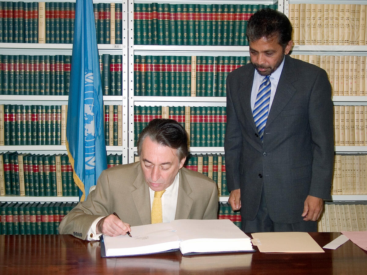 Ambassador Cesar Mayoral (seated), Permanent Representative of Argentina, signs the International Convention on the Protection of the Rights of All Migrant Workers and Members of their Families.