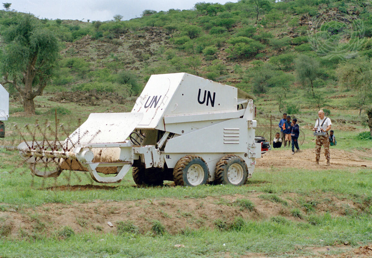 UNMEE Slovakian deminer using a remote control device to operate a demining flail.