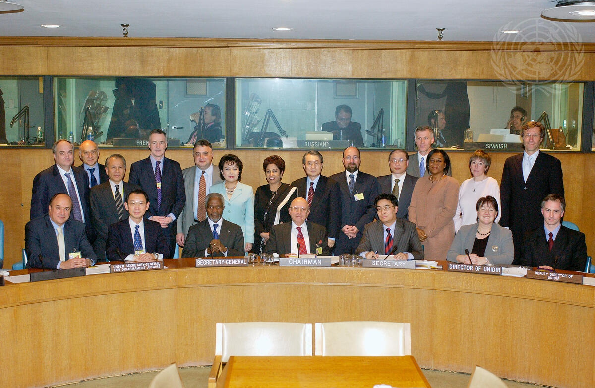 Secretary-General Kofi Annan (third from left, seated) and members of the Advisory Board. The Secretary-General delivered opening remarks at the meeting of the Advisory Board on Disarmament Matters, today at UN Headquarters.