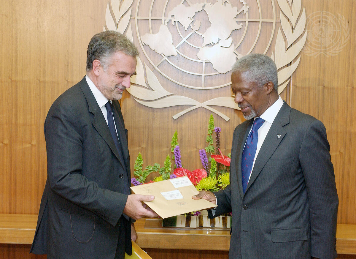 Secretary-General Kofi Annan (right) meets with Luis Moreno Ocampo, Chief Prosecutor of the International Criminal Court (ICC), to hand over a list of Darfur war crimes suspects.