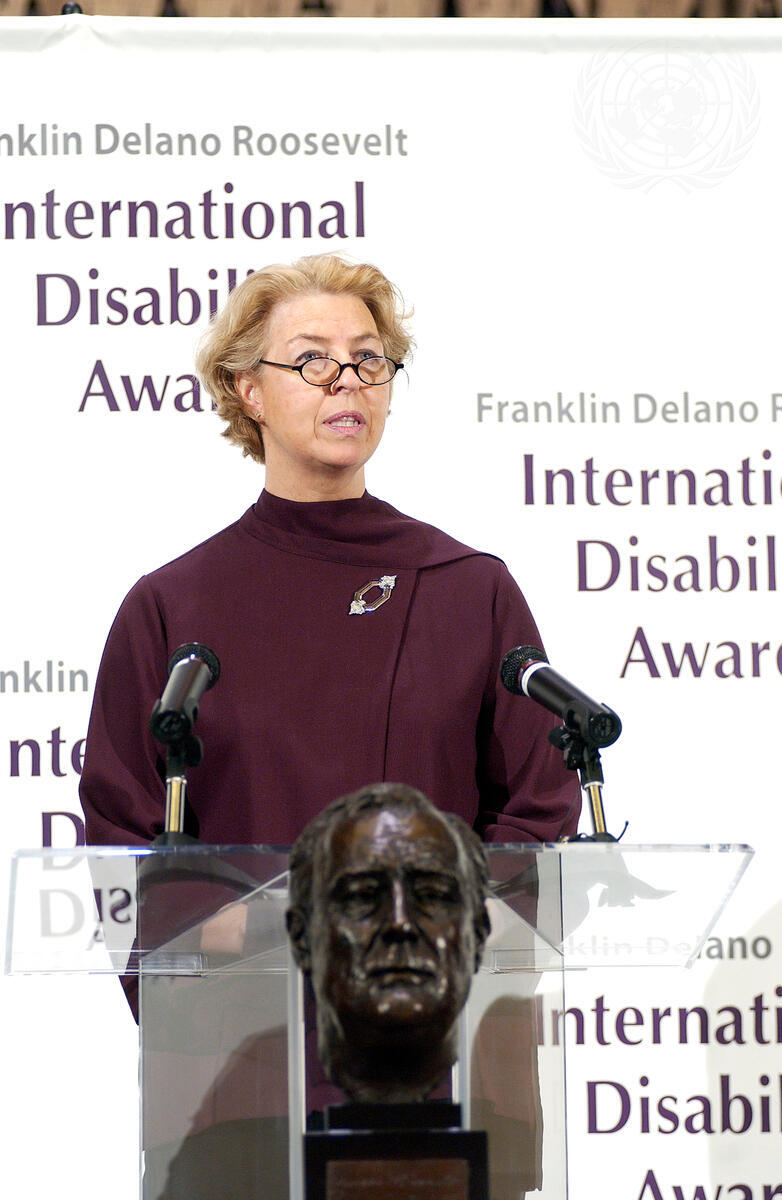 Anna Eleanor Roosevelt, granddaughter of Franklin and Eleanor Roosevelt and Co-Chair of the Franklin and Eleanor Roosevelt Institute, speaking at the 8th Franklin Delano Roosevelt International Disability Award presentation ceremony. The Award was given to Jordan for its exemplary efforts to improve the lives of persons with disabilities by introducing building codes aimed at accessibility and carrying out a wide range of activities aimed at its disability community.