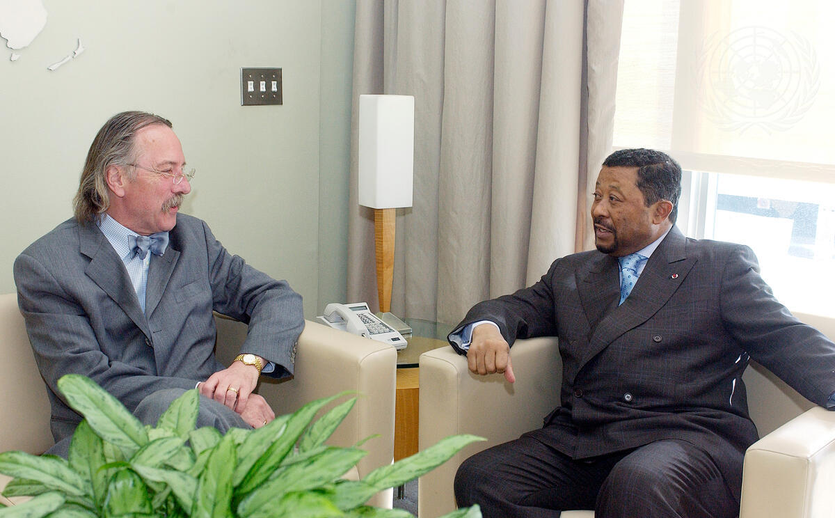 Jean Ping (right), President of the fifty-ninth session of the General Assembly, meets with Anders B. Johnsson, Secretary General of the Inter-Parliamentary Union (IPU), today at UN Headquarters.