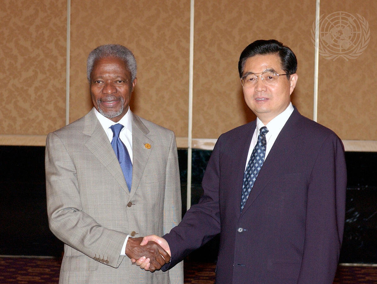 Secretary-General Kofi Annan (left) meets today with Hu Jintao, President of the People's Republic of China, in Jakarta, Indonesia, where he is attending the Asian-African Summit 2005.