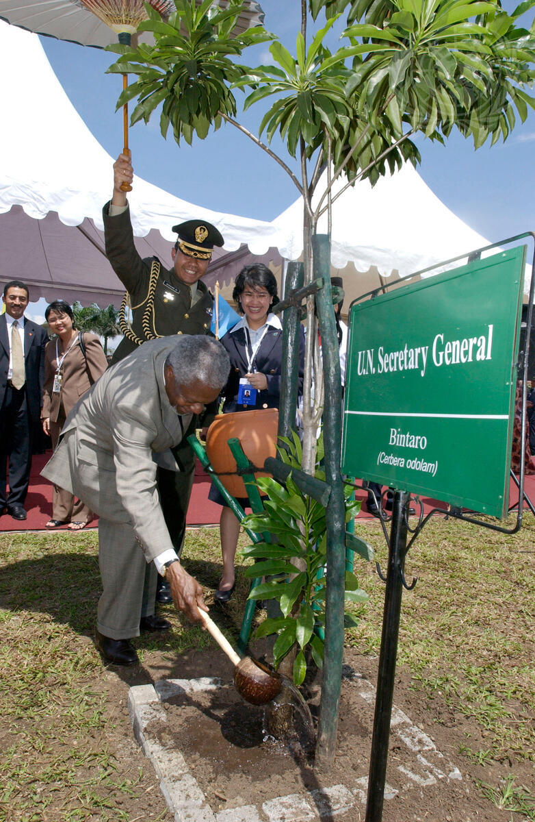 Secretary-General Kofi Annan planting an African tree at the Tegallega Garden, in Bandung, Indonesia, where the conference for the Golden Jubilee of the Asian-African Conference of 1955 was held.
