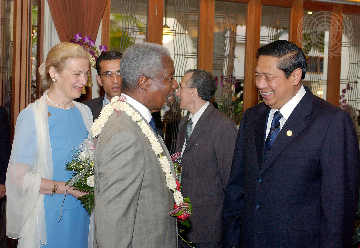 Secretary-General Kofi Annan (second from left) and Mrs. Nane Annan (left) greet Susilo Bambang Yudhoyono, President of the Republic of Indonesia, as they arrive today at the Savoy Homan Hotel in Bandung, Indonesia, to commemorate the Golden Jubilee of the Asian-African Conference of 1955.