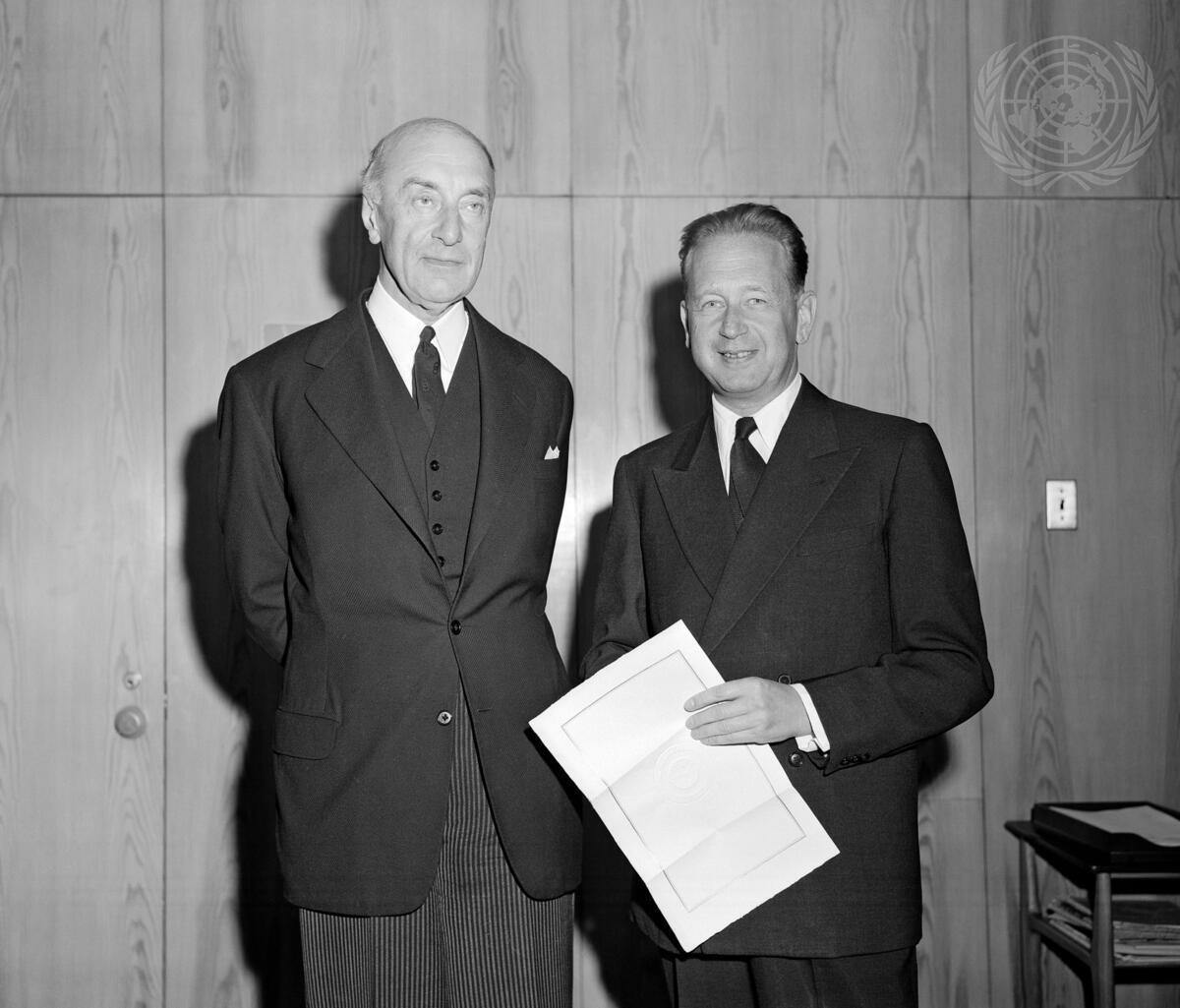 Mr. George de Gripenberg (left), first Permanent Representative of Finland to the United Nations, presented his credentials to Dag Hammarskjöld, Secretary-General of the United Nations, today at Headquarters. The two men are seen here posing for photographs, after the ceremony.