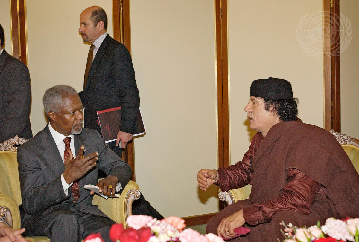 Secretary-General Kofi Annan (left) meets with Muammar Al-Qadhafi, President of the Socialist people's Libyan Arab Jamahiriya, in Algiers. The Secretary-General visited Algeria to attend the Summit of the League of Arab States.
