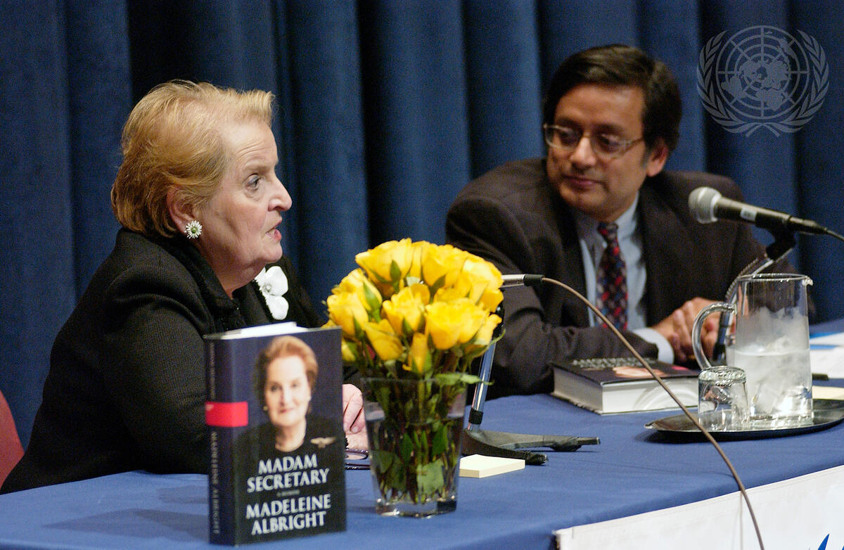 Madeleine Albright (left), former Secretary of State of the United States, discusses her memoir ""Madam Secretary"" at today's book signing at UN Headquarters. At right is Shashi Tharoor, Under-Secretary-General for Communications and Public Information.