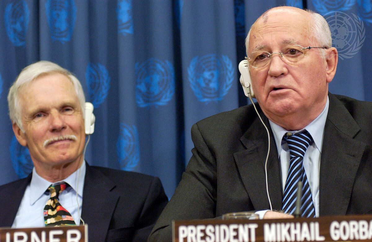 Mikhail Gorbachev (right), former President of the Soviet Union, briefing correspondents on the 2005 Alan Cranston Peace Award today at UN Headquarters. Mr. Gorbachev will present the award on behalf of the Global Security Institute to Ted Turner (left) for his outstanding work to end threats posed by nuclear weapons, his active support of the United Nations, his advocacy for sustainable development, and his visionary leadership in communications, business and philanthropy.