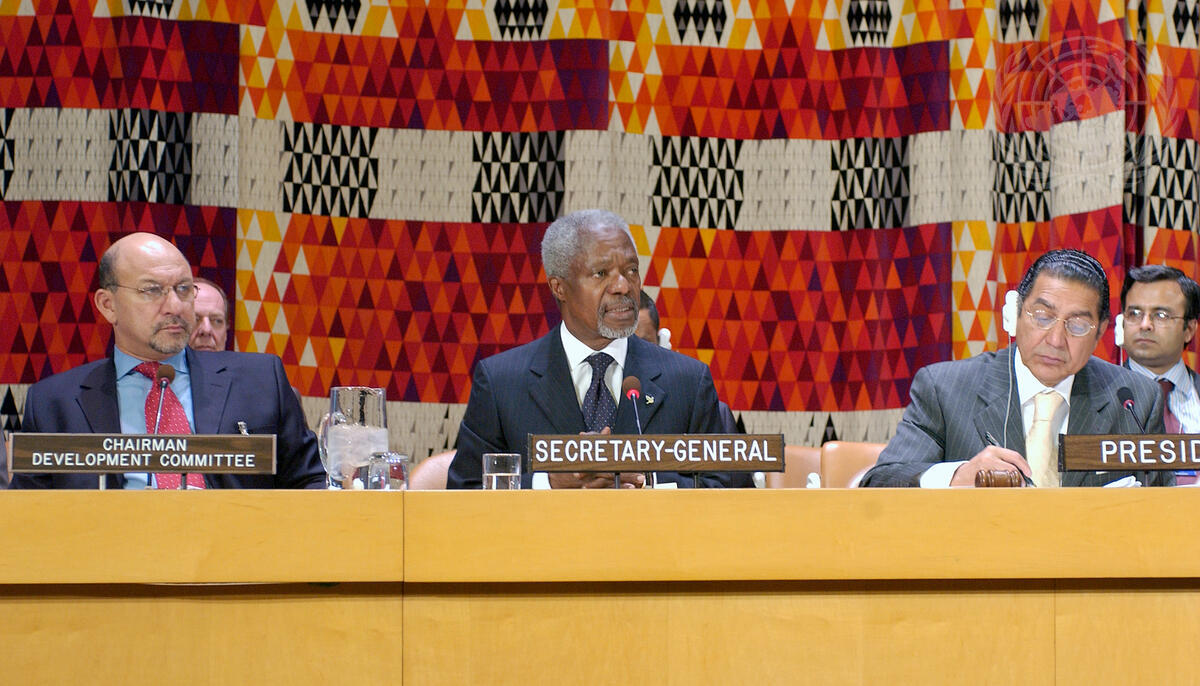 Secretary-General Kofi Annan (centre) addressing today's high-level meeting of the Economic and Social Council with the Bretton Woods institutions, the World Trade Organization (WTO) and the United Nations Conference on Trade and Development (UNCTAD) at UN Headquarters. From left to right: Manuel Trevor (South Africa), Chairman of the Development Committee of the World Bank and the International Monetary Fund (IMF); Mr. Annan; and Munir Akram (Pakistan), President of the Economic and Social Council.