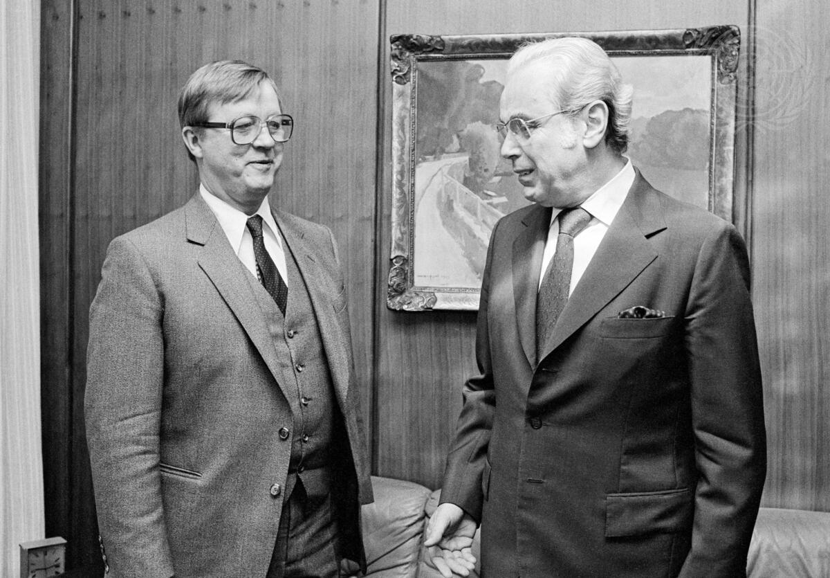 Secretary-General Javier Perez de Cuellar (right) meeting in his United Nations Headquarters office this morning with Kalevi Sorsa, Prime Minister of Finland.