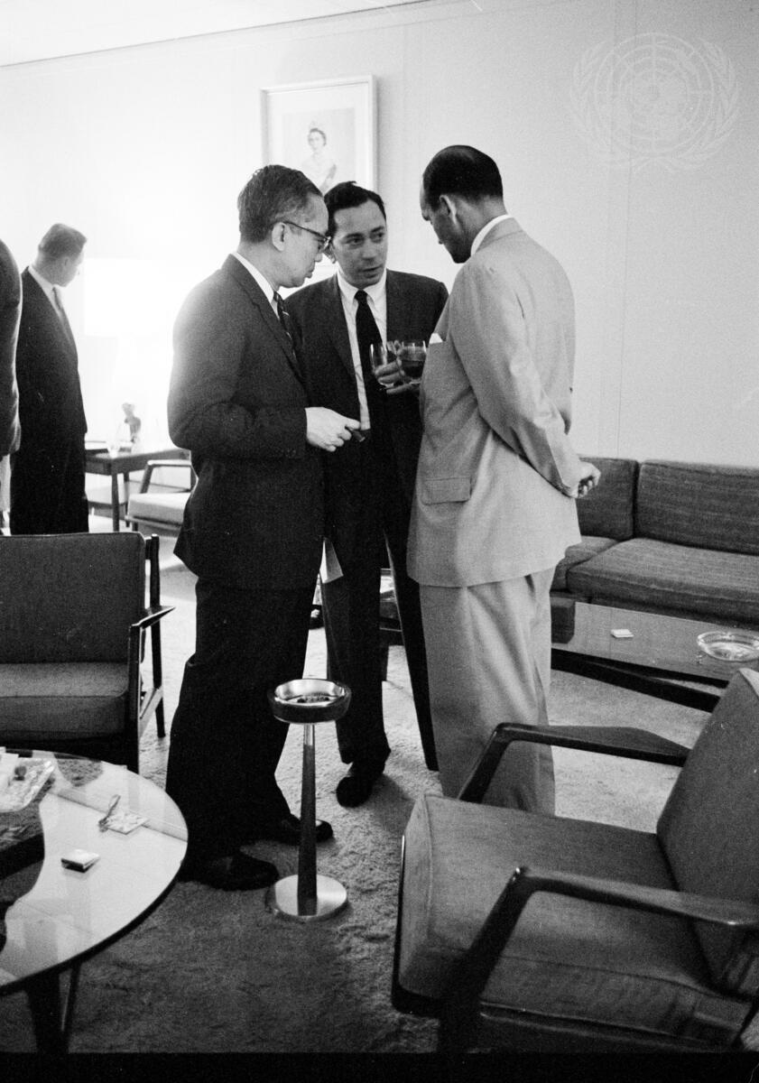 U Thant (left) is seen at New York's Idlewild Airport, prior to his departure, conversing with Mr. Ramses Nassif (centre), Information Officer, who will accompany the Secretary-General on his trip; and Mr. C.V. Narasimhan, UN Under-Secretary for General Assembly Affairs and Chef de Cabinet.