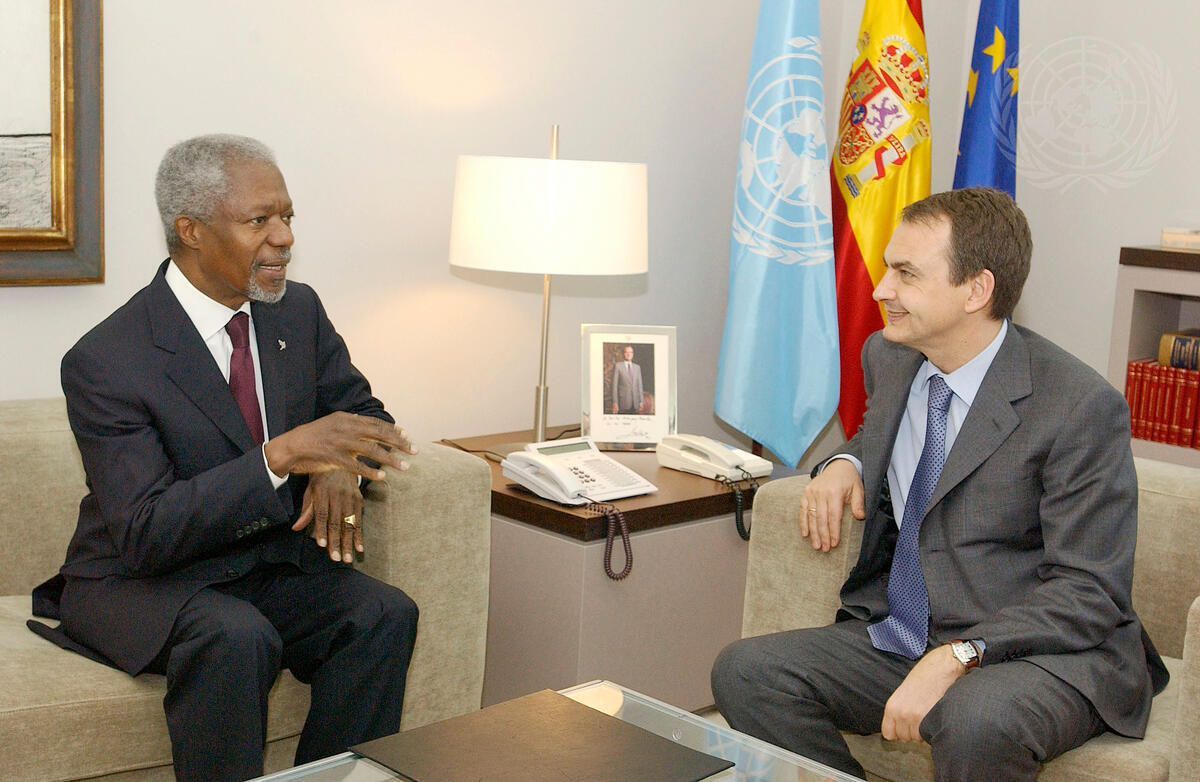 Secretary-General Kofi Annan (left) meets with José Luis Rodríguez Zapatero, Prime Minister of Spain. They talked on a range of global issues, discussing developments in Iraq, the Middle East, including Syria and Lebanon, Western Sahara and UN reform.