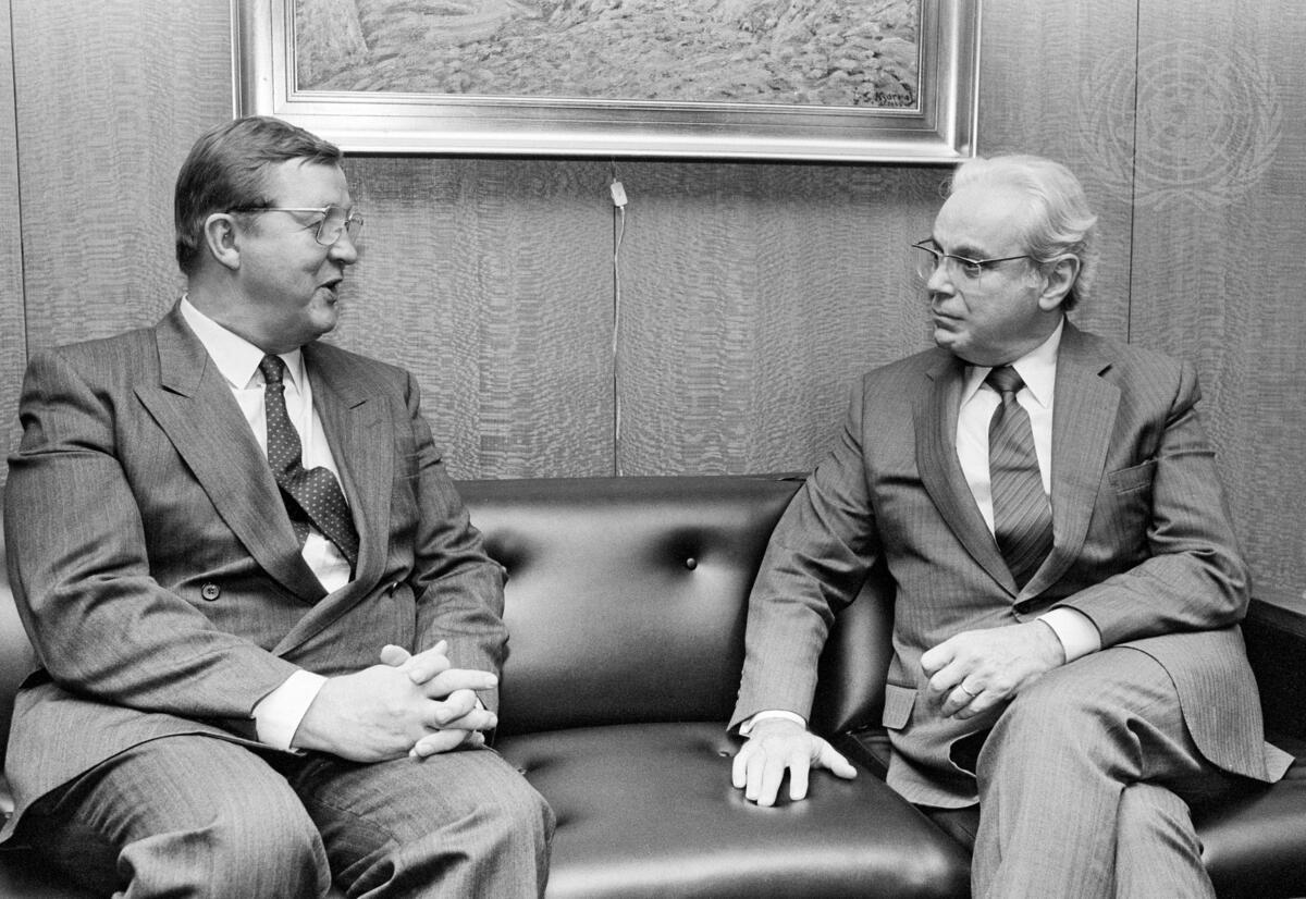 Secretary-General Javier Perez de Cuellar (right) meets today at UN Headquarters with Kalevi Sorsa, Minister of Foreign Affairs of Finland. The Foreign Minister is here to address the forty-third session of the General Assembly.