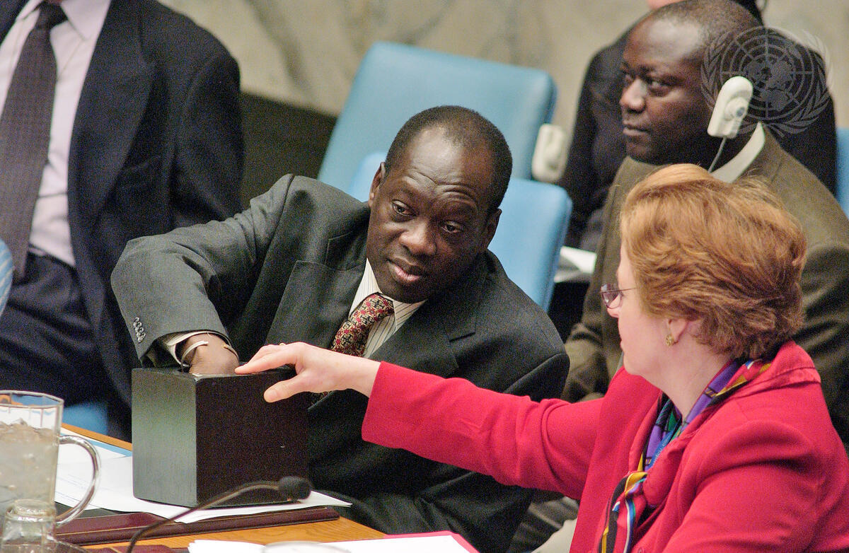 Joël W. Adechi (left), Permanent Representative of the Republic of Benin to the United Nations and President of the Security Council for the month of February 2005, during the election of a member of the International Court of Justice. The Security Council met this morning to elect a new member of the International Court of Justice.