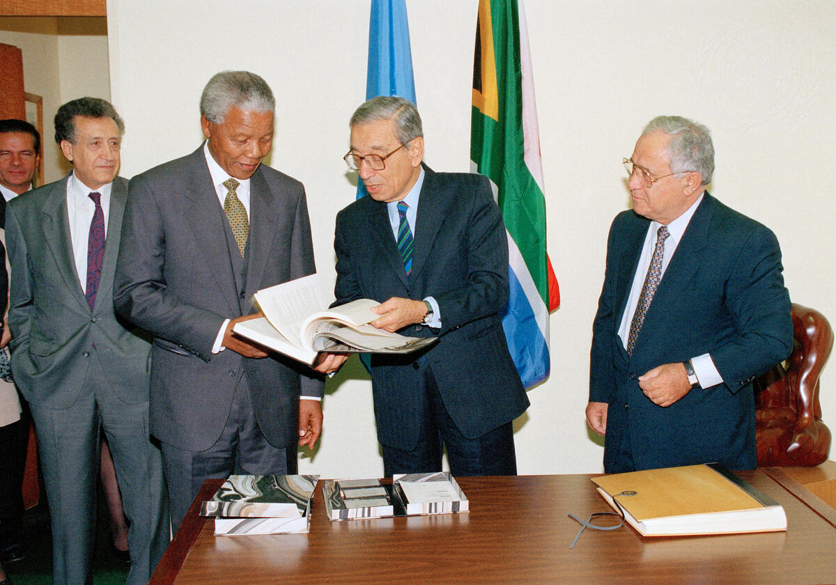 Secretary-General Boutros Boutros-Ghali (second from right) presents an advance copy of a book entitled: ""The United Nations and Apartheid, 1948-1994"" to President Nelson Mandela of the Republic of South Africa, at UN Headquarters in New York. Samir Sanbar (right) is the Assistant Secretary-General, Department of Public Information, and Lakhdar Brahimi (second from left) is former Secretary-General's Special Representative for South Africa and currently is his Special Representative for Haiti.