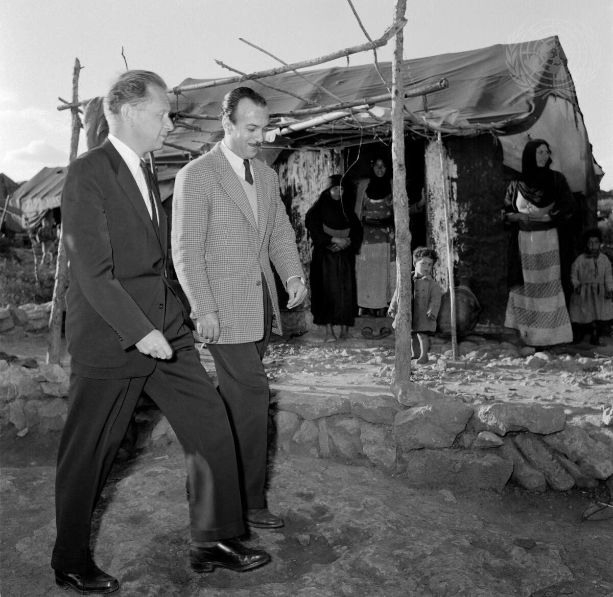 Mr. Hammarskjöld is seen here (at left) at Dekwaneh; explaining the organization of UNRWA camps is George Safouri, area officer for the Beirut district.