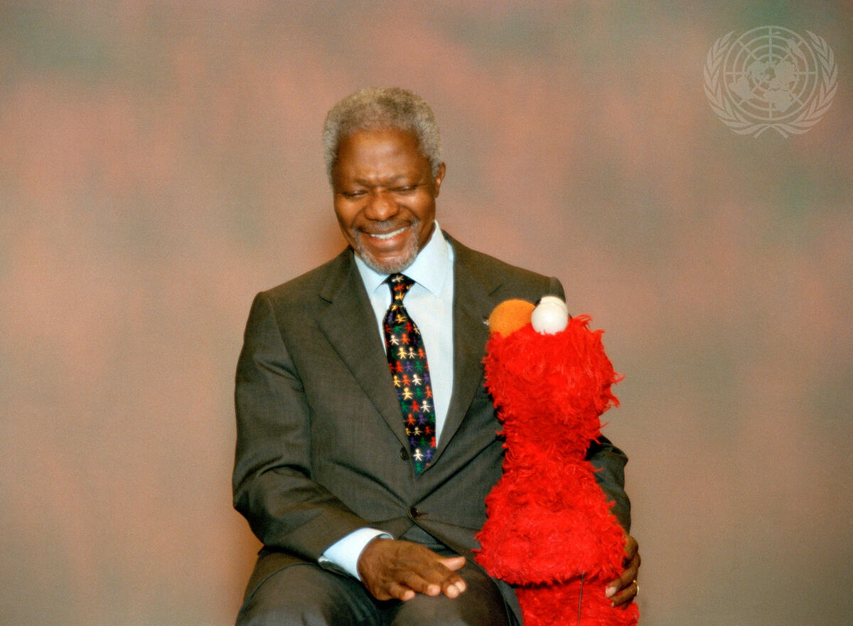 Secretary-General Kofi Annan taping a segment of "Sesame Street" with Elmo.