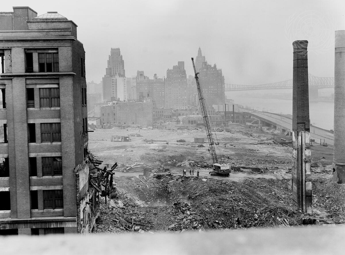 Partial view of the Manhattan site of the United Nations permanent headquarters showing progress of demolition work.