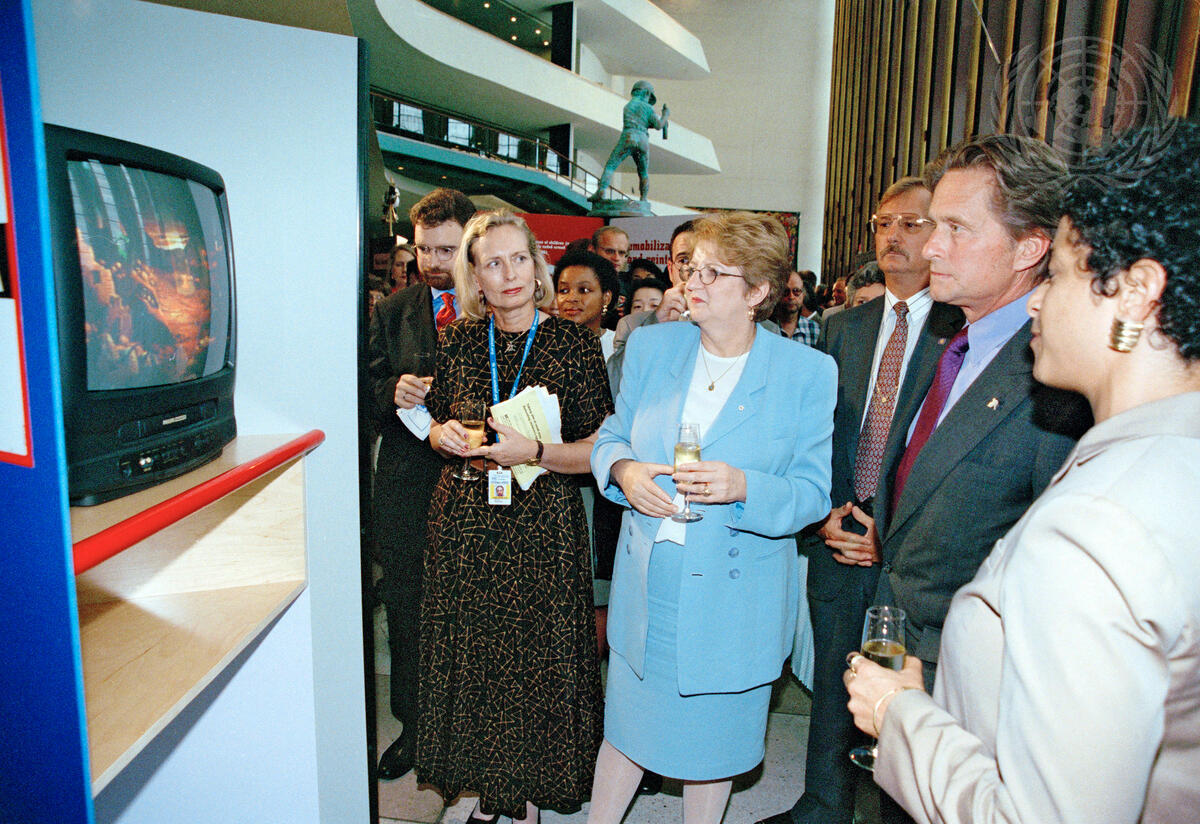 Deputy Secretary-General Louise Fréchette (centre) and actor Michael Douglas (second from right), a United Nations Messenger of Peace, view a video that forms part of a Headquarters exhibit entitled ""Taking Aim at Small Arms: Defending Children's Rights"". They were present to mark the opening of the exhibit, which is sponsored by the Department for Disarmament Affairs and the United Nations Children's Fund (UNICEF), with the support of the Permanent Mission of Andorra to the United Nations. Also pictured (left to right) are: Juli Minoves-Triquell, Permanent Representative of Andorra to the United Nations and Karin Sham Poo, the Deputy Executive Director of UNICEF.