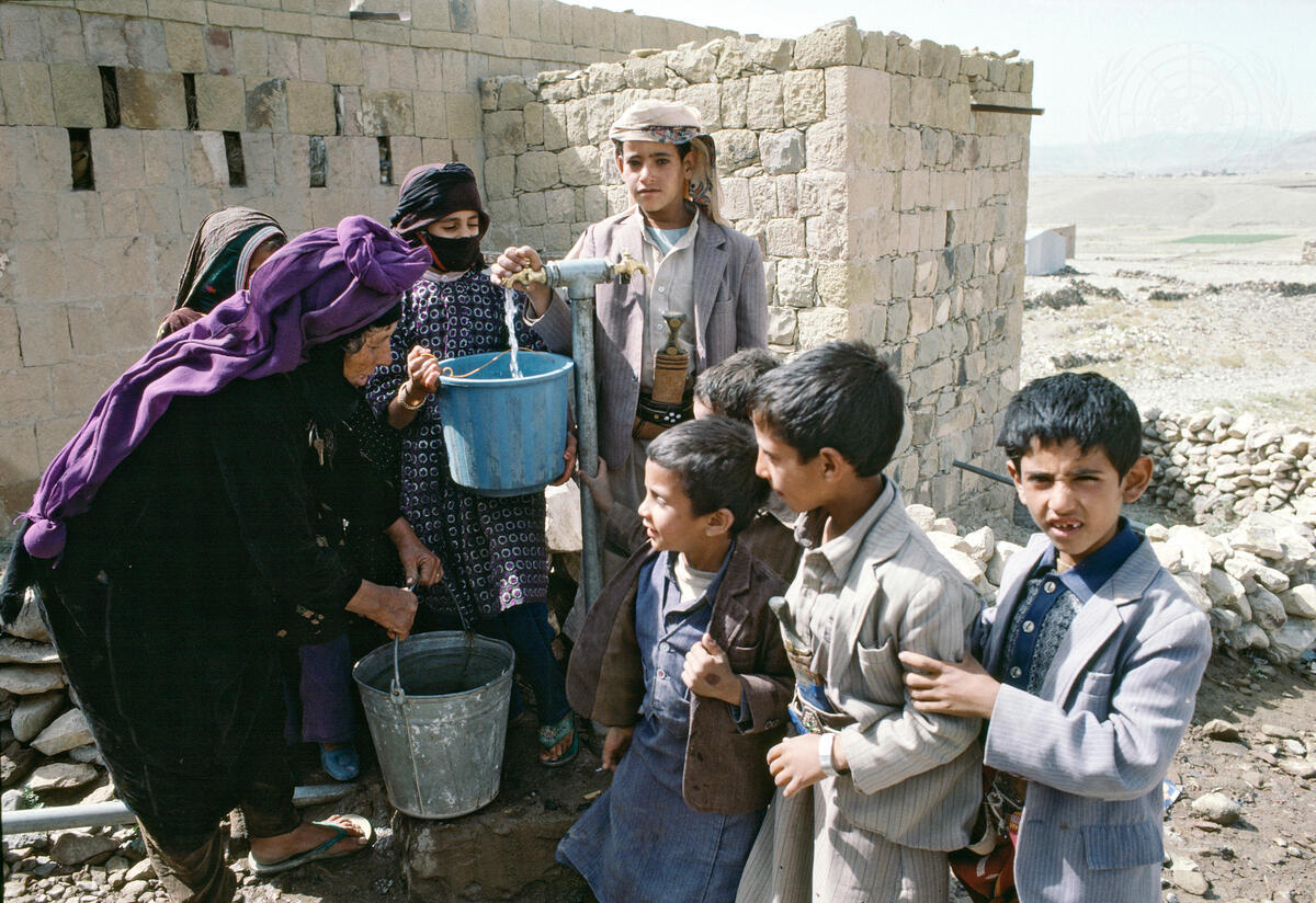 Children helping an old woman fill her containers with water from a community pump in Dobra Khira near Sanaa.