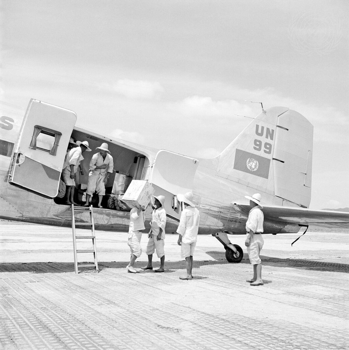 Bringing supplies to the United Nations Commission on Korea, the UN own DC-3, who is known as ""UN Ninety-nine"" merely as a convenient contraction, is unloaded by Korean porters.