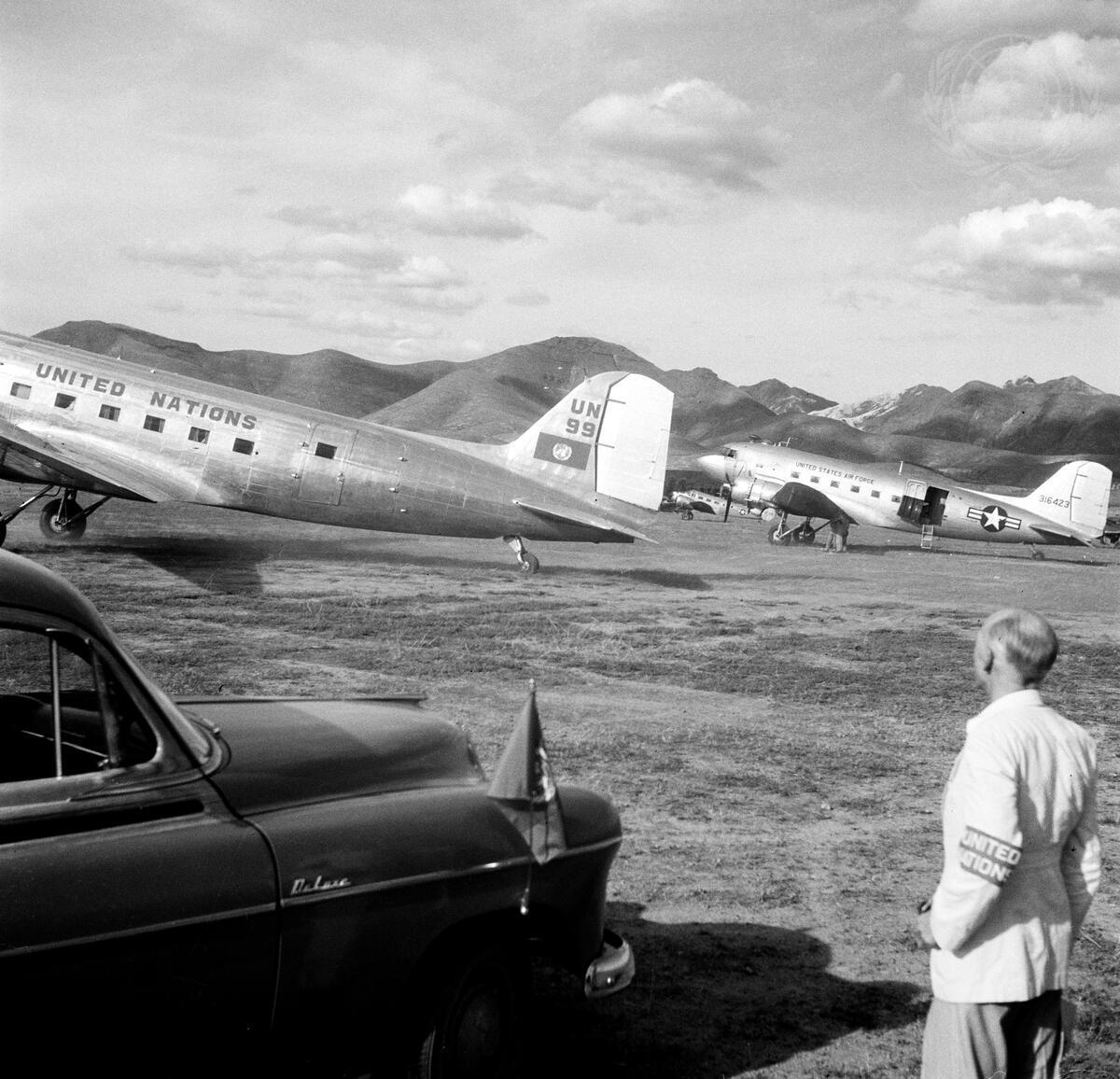 The United Nations DC-3, known as ""UN 99"", at Pusan airfield; in the foreground is Mr. Louis Shapard, UNCOK (UN Commission on Korea) Legal Assistant and translator, and one of the Commission's vehicles. The plane is used to transport UN personnel, mission members, essential supplies for the Commission and occasional passengers.