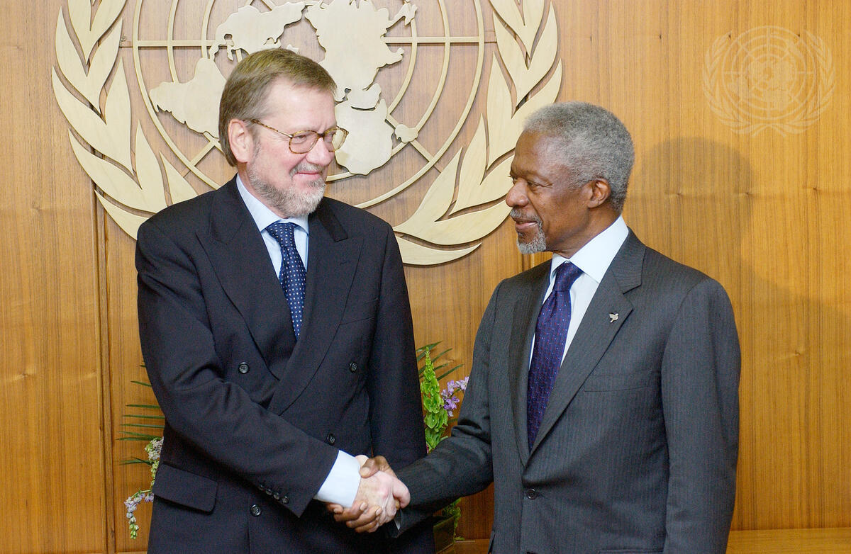 Secretary-General Kofi Annan (right) meets with Per Stig Moeller, Minister for Foreign Affairs of Denmark.