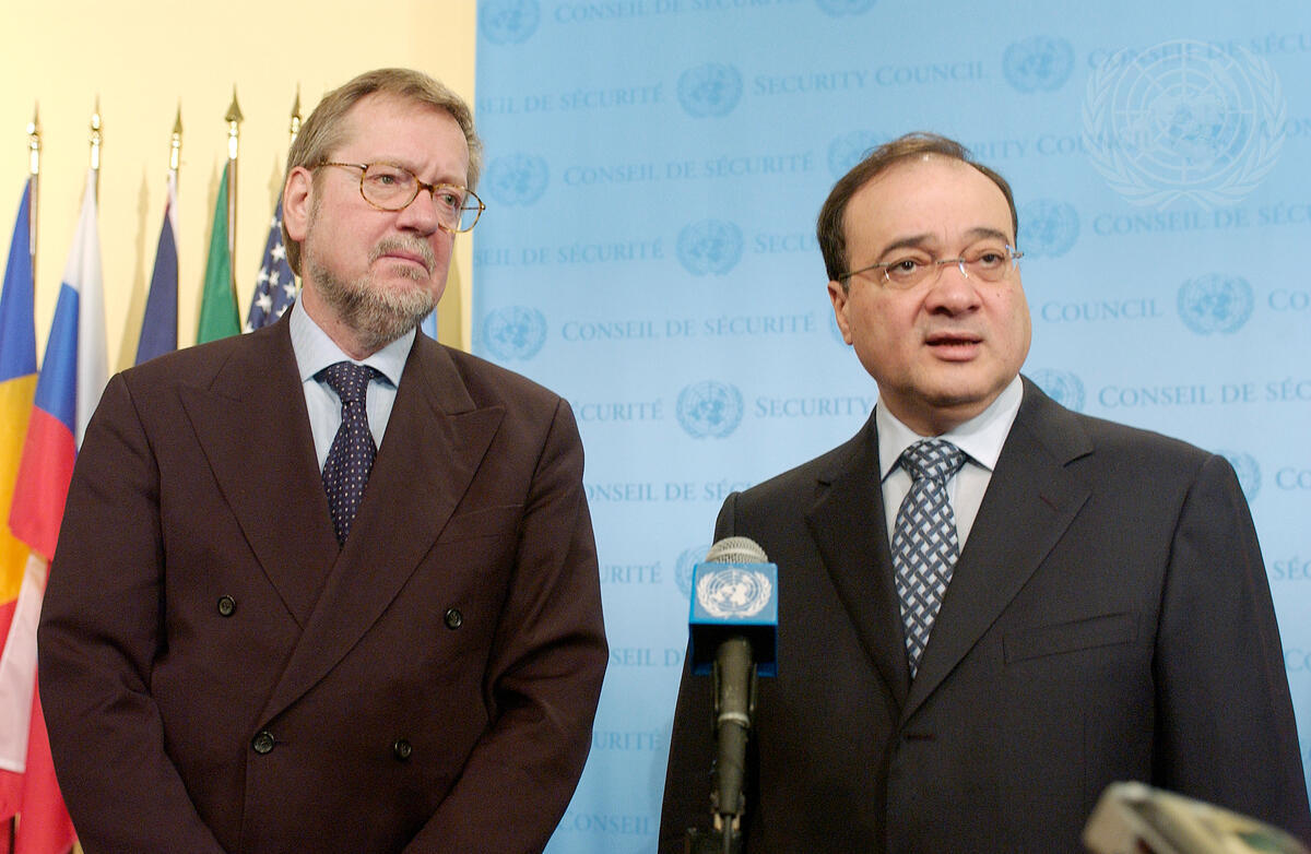 Per Stig Moeller (left), Minister for Foreign Affairs of Denmark, and Nasser Al-Kidwa, Permanent Observer of the Permanent Observer Mission of Palestine, briefing correspondents today at UN Headquarters.