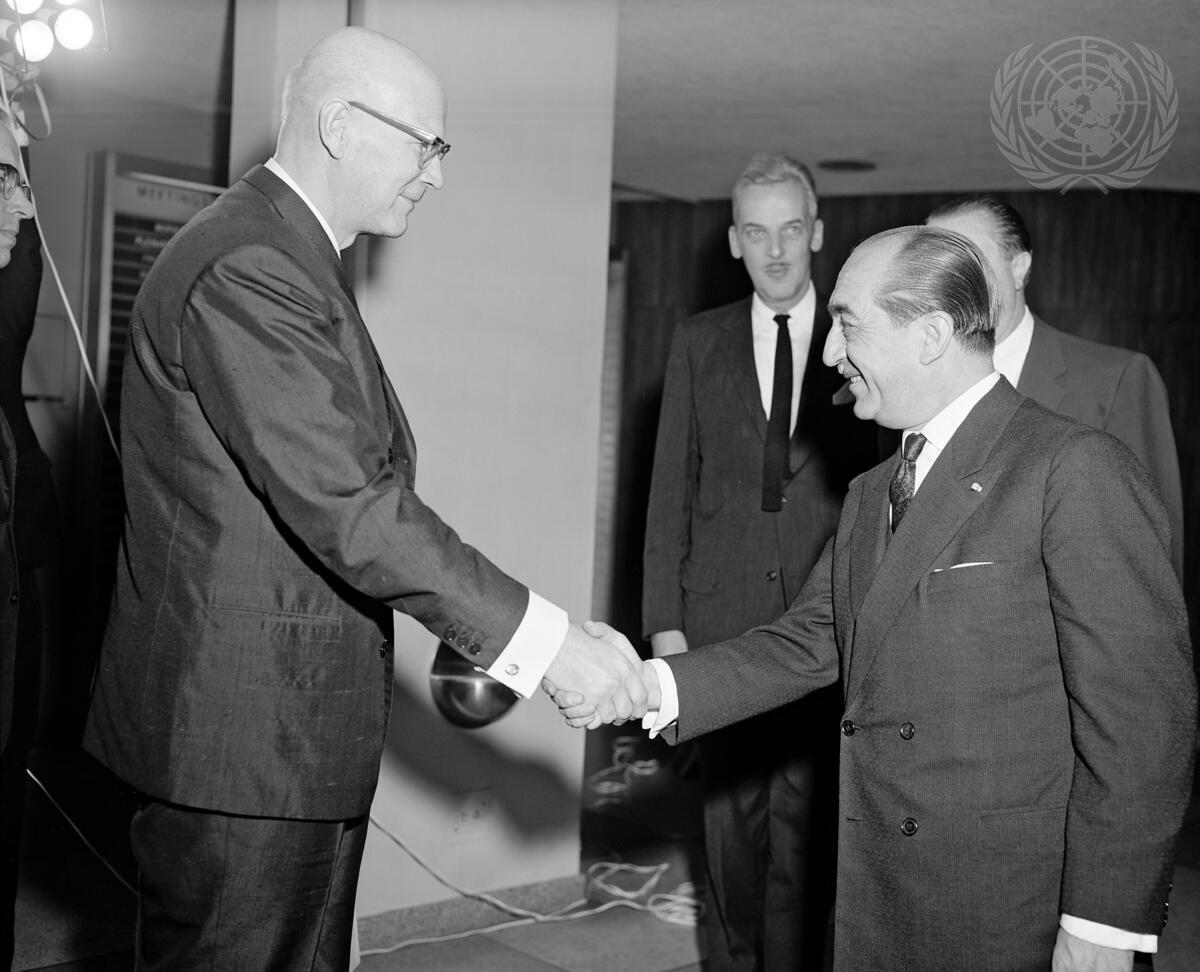 President Kekkonen (centre) is seen at the Delegates' Entrance as he was greeted by Ambassador Mongi Slim (Tunisia), President of the General Assembly.