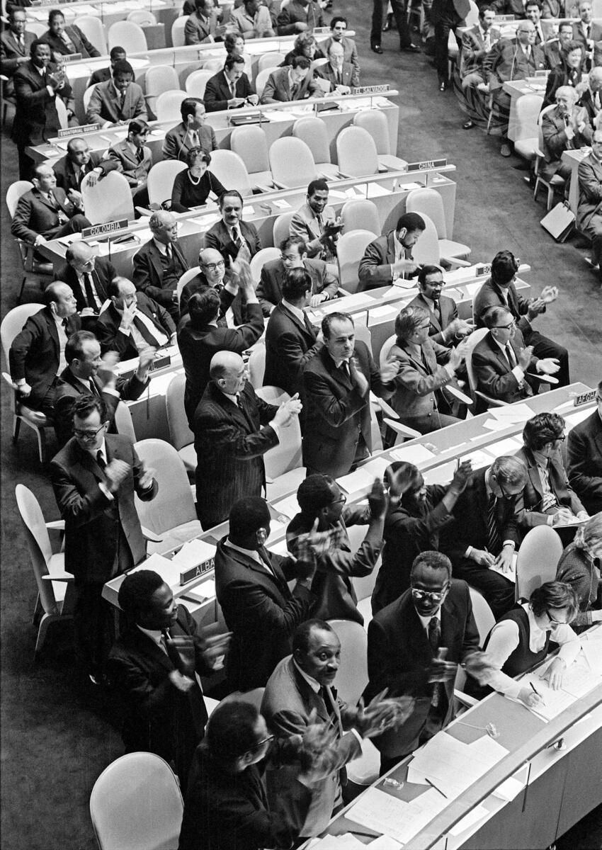 Delegates applauding after the draft resolution, sponsored by Albania and 22 other nations, was adopted. The empty seats of the Chinese delegation, which had left before the vote, can be seen in the background.