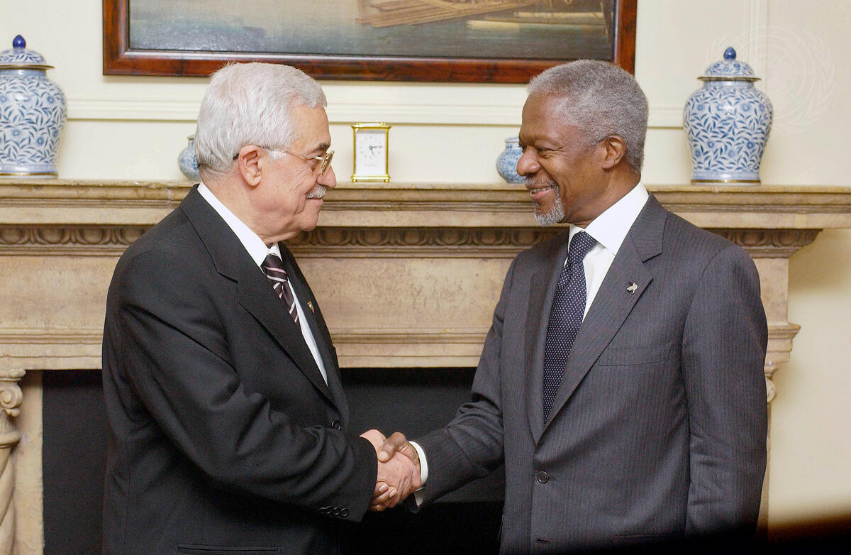 Secretary-General Kofi Annan (right) meets with Mahmoud Abbas, President of the Palestinian National Authority (PNA), at the Dorchester Hotel in London during his visit to attend the Conference in Support of the Palestinian Authority.