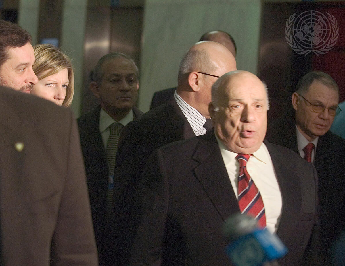 Rauf Denktash, Turkish Cypriot Leader, briefs correspondents at UN Headquarters.