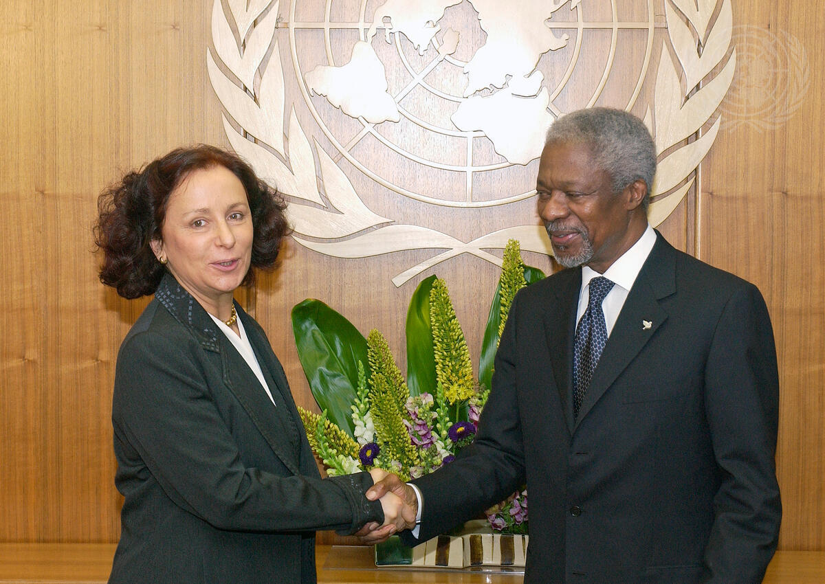 Secretary-General Kofi Annan (right) meets with Ana Palacio, Minister for Foreign Affairs of Spain.
