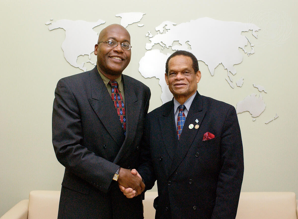 Julian Robert Hunte (Saint Lucia) (right), President of the fifty-eighth session of the General Assembly, meets with Carl Breeveld, Founder and President of Man Mit Man of the Republic of Suriname.