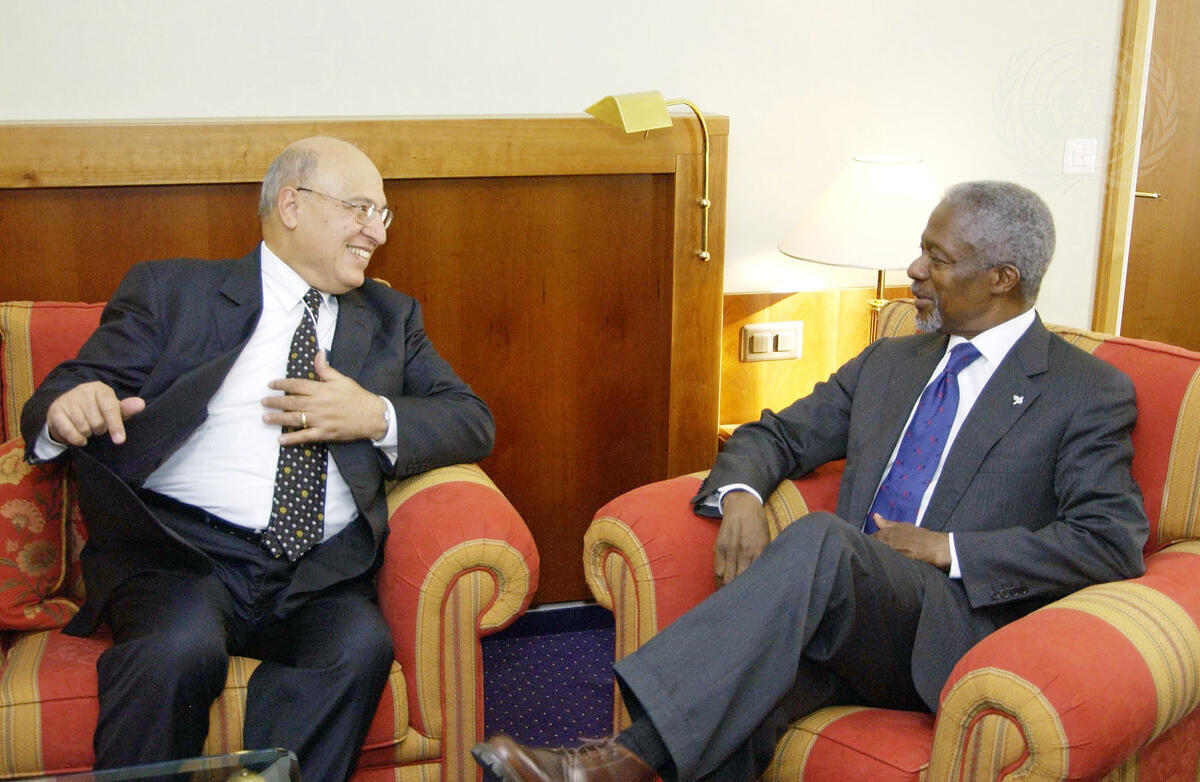Secretary-General Kofi Annan (right) meets with Nabil Shaath, Minister of External Affairs of the Palestinian National Authority. The Secretary-General traveled to Davos, Switzerland, on the second leg of his 12-day trip to Europe, where he delivered the keynote address on ""The Challenges of Globalization and Governance"" at the annual World Economic Forum.