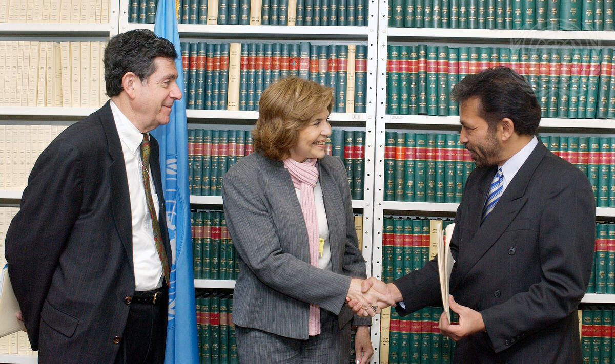 Marta Altolaguirre-Larraondo (centre), Deputy Minister for Foreign Affairs of Guatemala, signed the ""Protocol to Prevent, Suppress and Punish Trafficking in Persons, Especially Women and Children,"" the ""Protocol Against the Smuggling of Migrants by Land, Sea and Air,"" and the ""Protocol Against the Illicit Manufacturing of and Trafficking in Firearms, Their Parts and Components and Ammunition.""