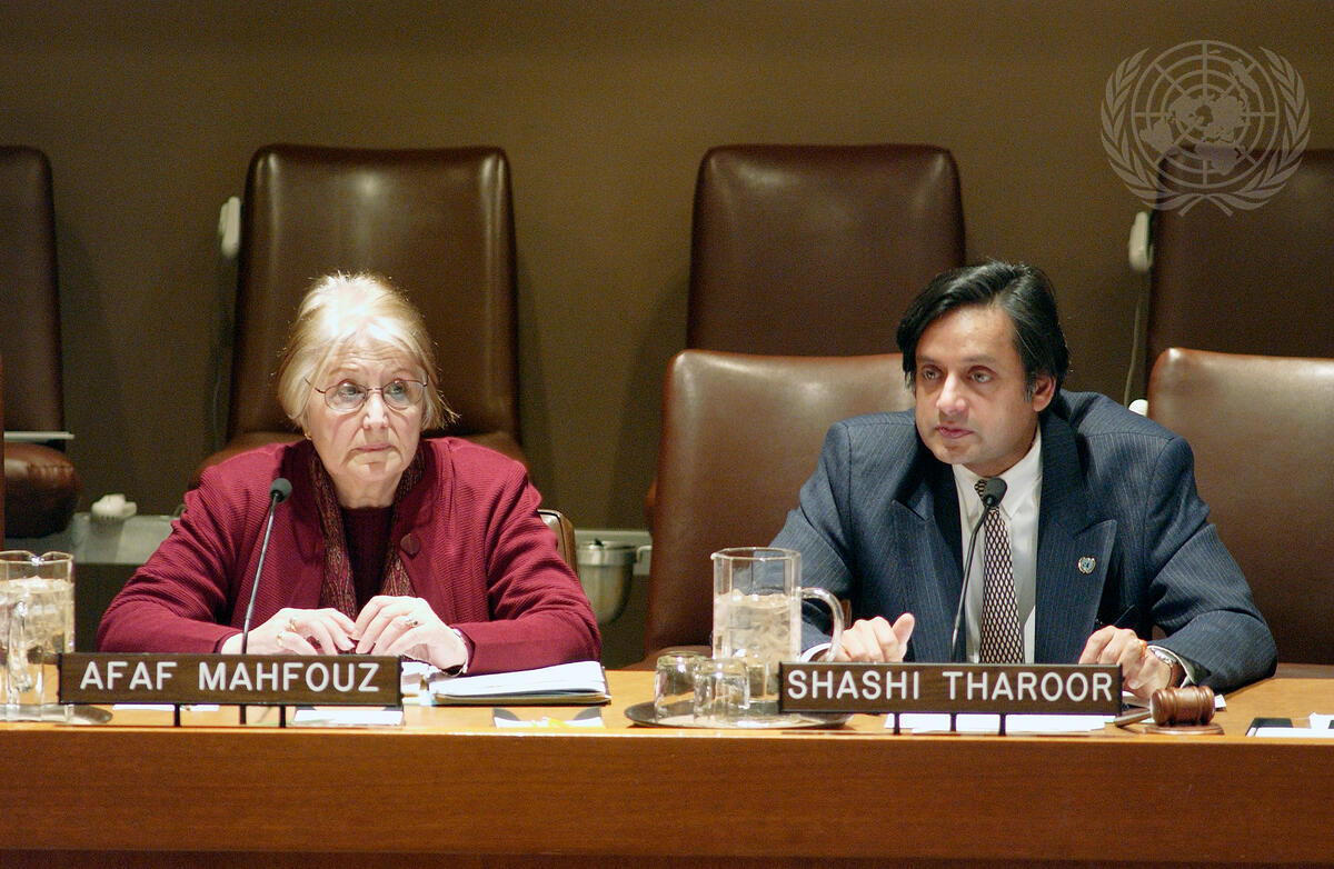 Afaf Mahfouz (left), International Psychoanalyst Association, and Shashi Tharoor, Under Secretary-General for Communications and Public Information, at today's briefing.