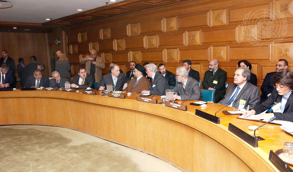 A wide shot of today's three-way talks. Secretary-General Kofi Annan hosted talks today with Members of the Iraqi Governing Council and the Coalition Provisional Authority (CPA) on the United Nations' future role in Iraq.