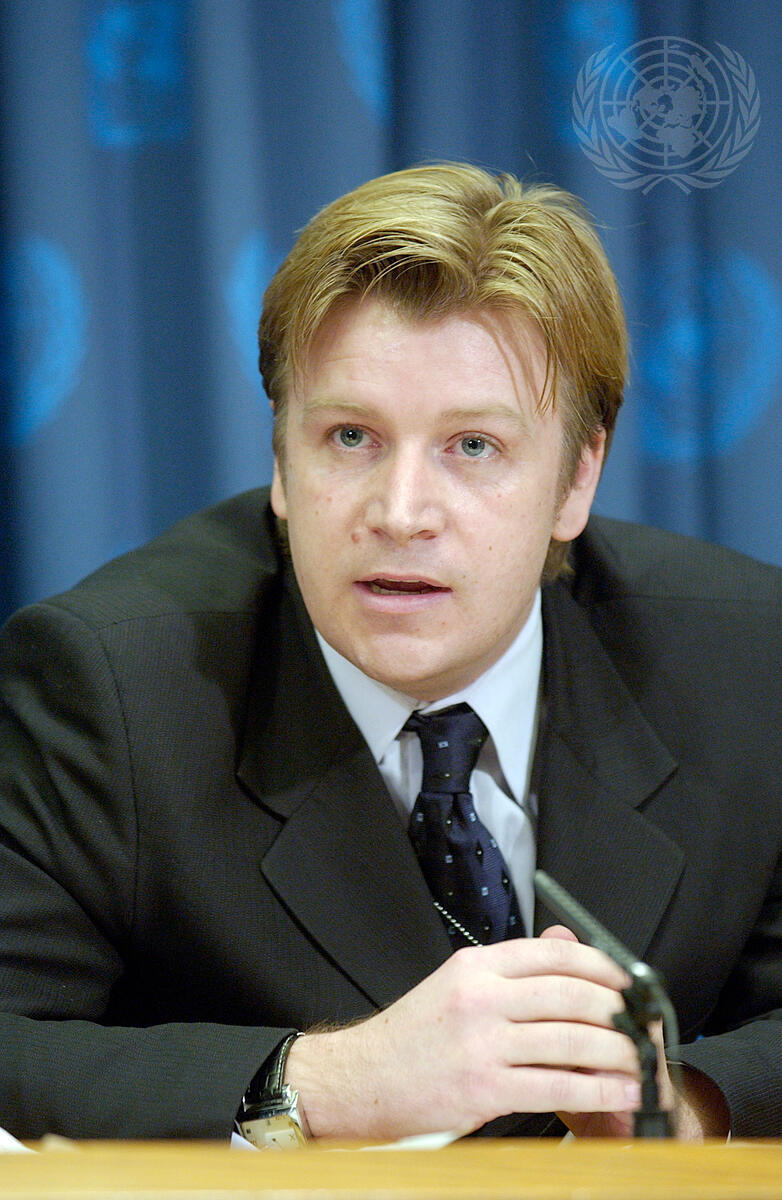 Andrew Johnson of Save the Children Alliance and Watchlist on Children and Armed Conflict briefing correspondents at today's press conference following the launch of the report "Protecting Children in Armed Conflict: Blueprints for Compliance."