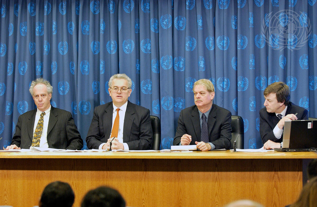 The Under-Secretary-General for Economic and Social Affairs held a press conference today at UN Headquarters to launch the ""World Economic Situation and Prospects 2004"" report. Left to right: Harris Gleckman, Chief of UNCTAD's New York office, Jose Antonio Ocampo, Under-Secretary-General for Economic and Social Affairs, Tim Wall, Development Section of Department of Public Information, and Ian Kinniburgh, Director of Development Policy and Planning Office of DESA.