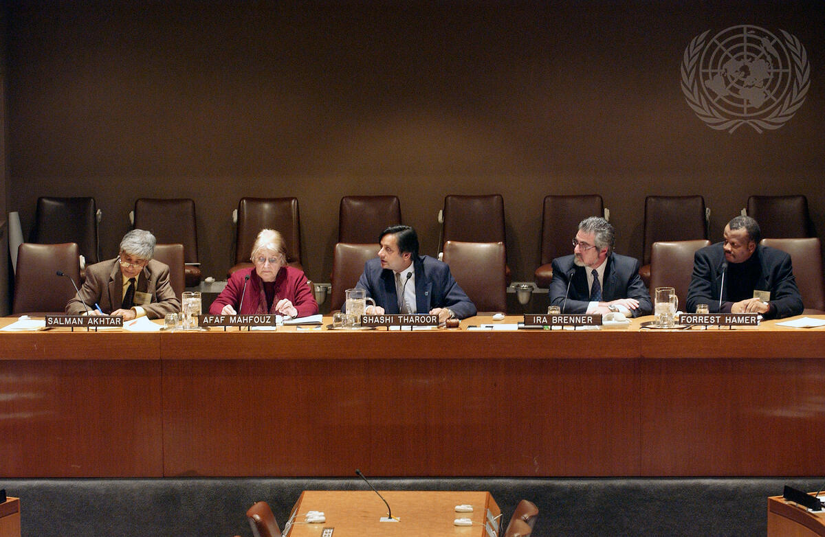 The weekly Department of Public Information/Non-governmental Organizations briefing was held at UN Headquarters on the topic of ""Anti-Semitism, Islamaphobia and Racism: New Perspectives on Old Menaces."" Left to right: Salman Akhtar, Jefferson Medical College, Afaf Mahfouz, International Psychoanalyst Association, Shashi Tharoor, Under Secretary-General for Communications and Public Information, Ira Brenner, American Psychoanalytical Association, and Forrest Hamer, University of California Berkeley.