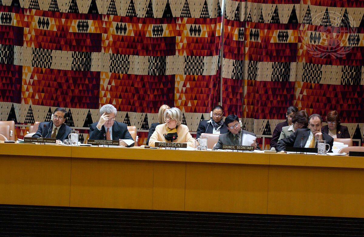 The Economic and Social Council (ECOSOC) this morning elected Marjatta Rasi of Finland as its President for 2004, the first woman to hold that post. Left to right at the podium: Sarbuland Khan, Director of Division for ECOSOC Support and Coordination of Department of Economic and Social Affairs, José Antonio Ocampo, Under-Secretary-General for Economic and Social Affairs, Marjatta Rasi, President of ECOSOC, and Permanent Representative of Finland to the United Nations, Nikhil Seth, Secretary of ECOSOC, and Moncef Khane, Deputy Secretary of ECOSOC.