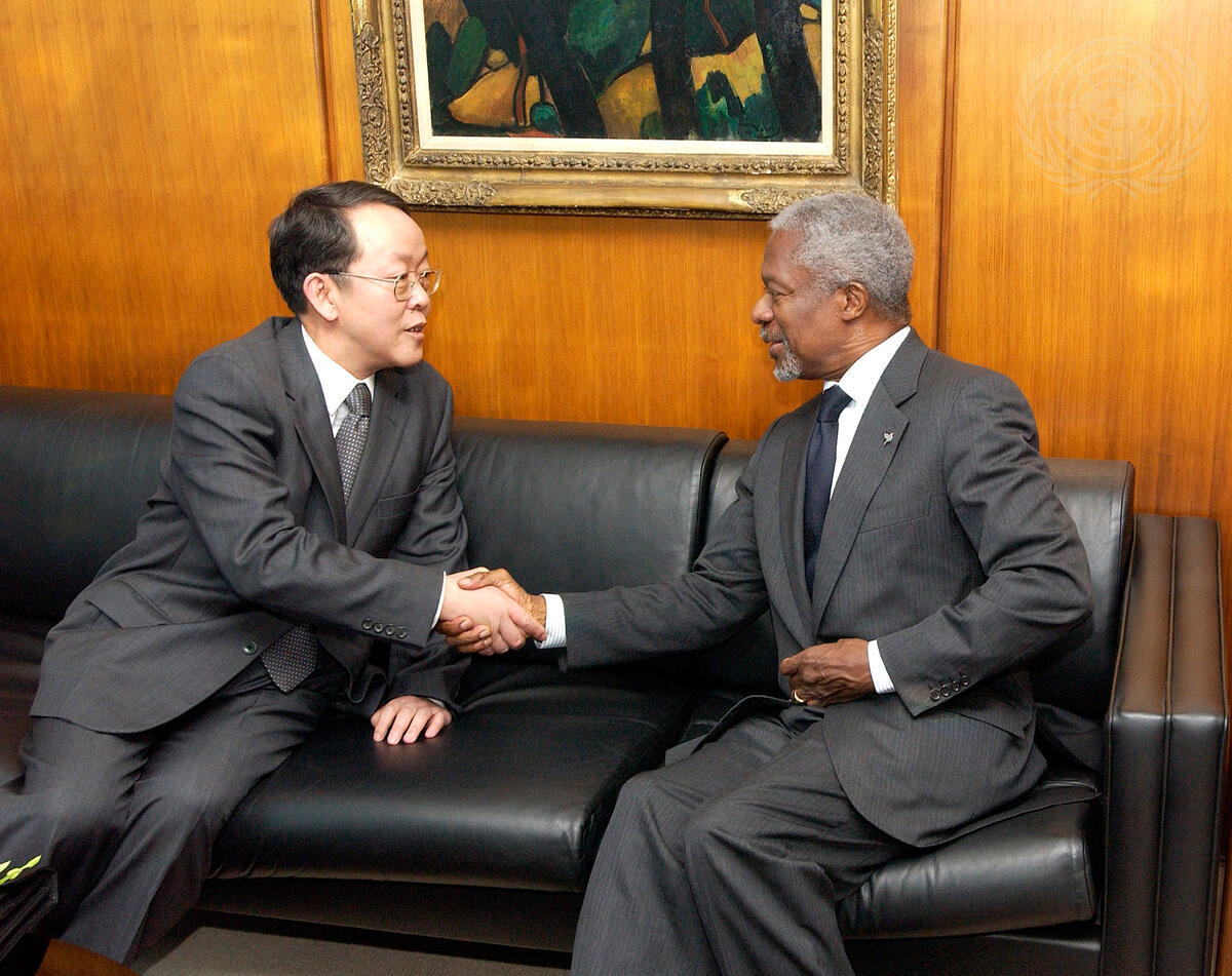 Secretary-General Kofi Annan (right) meets with Wang Guangya, Permanent Representative of the People's Republic of China to the United Nations, and President of the Security Council for the month of February.