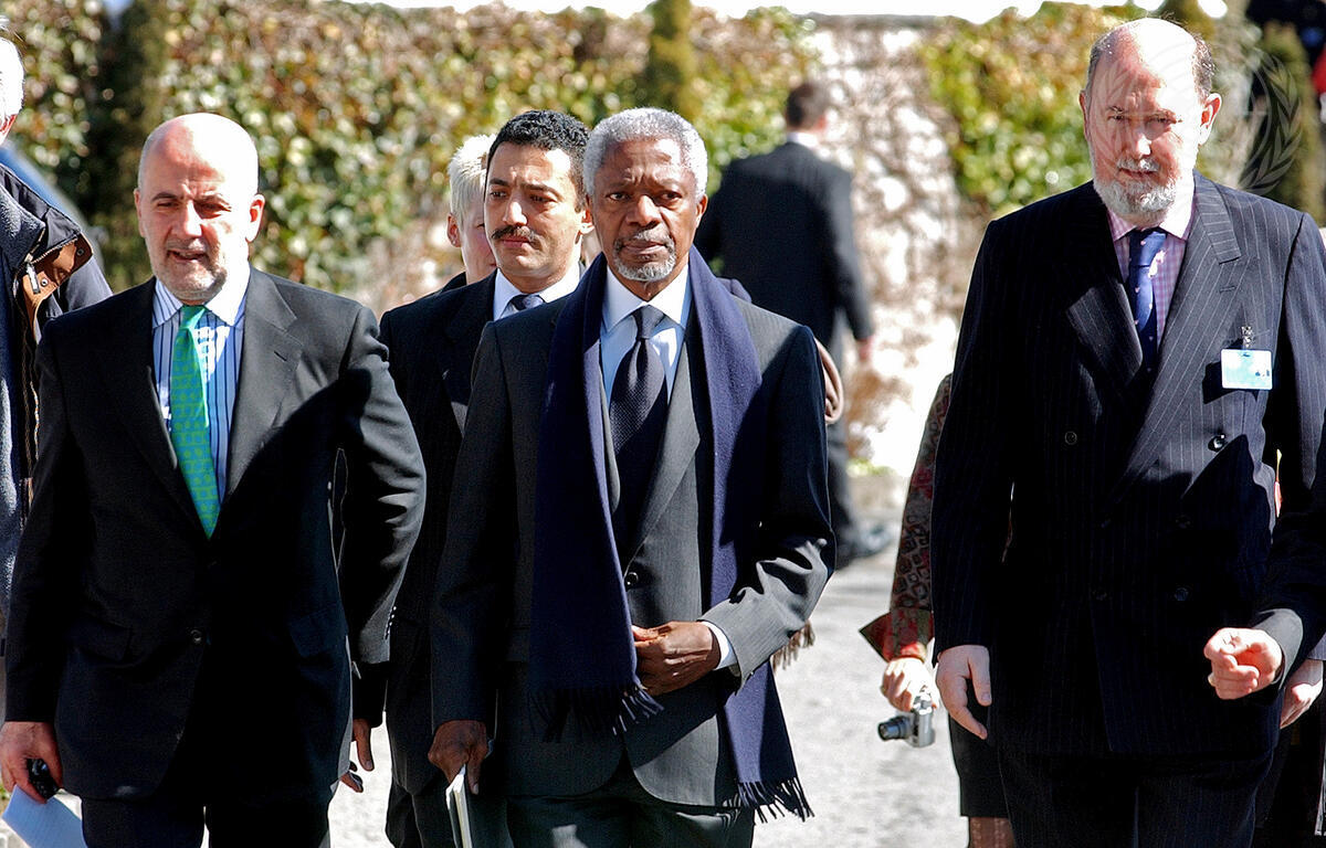 Left to right: Alvaro de Soto, Special Representative of the Secretary-General on Cyprus, Mr. Annan, and Kieran Prendergast, Under-Secretary-General for Political Affairs.