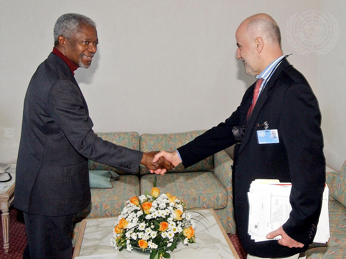 Mr. Annan (left) shaking hands with Alvaro de Soto, Special Representative of the Secretary-General on Cyprus.